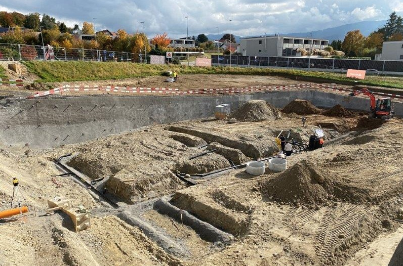 Baustelle Schulhaus Château d’Eau in Marly 20 Okt. 2021 Ein Einblick auf die Baustelle in Marly mit der Verlegung der Kanalisation.