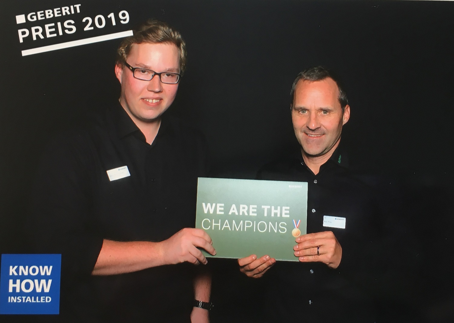 La formation nous tient à cœur ! Pour cette raison, nous sommes très fiers des deux prix Geberit 2019 attribués à M. Tobias Baumgartner pour le meilleur résultat aux examens de fin d’apprentissage en tant que projeteur en technique du bâtiment sanitaire et à M. Alain Piller en tant que responsable des apprentis.